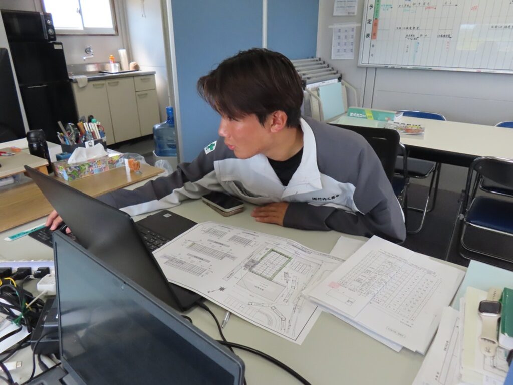 KY活動表や新規入場者に関する書類の作成・整理を行い、施工図の作成や明日の作業内容の確認・準備を進めます。分からないことも多いですが、日々学びながら業務に取り組んでいます。